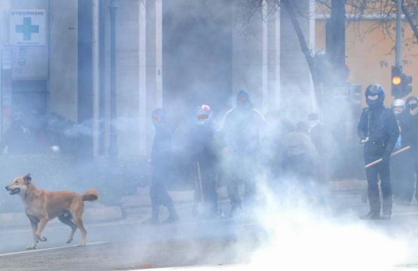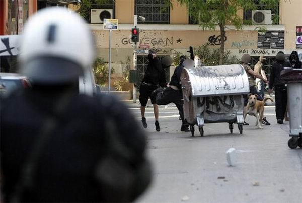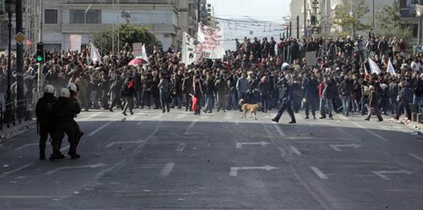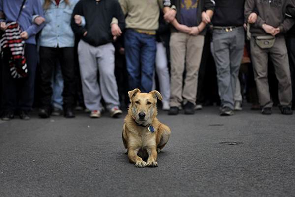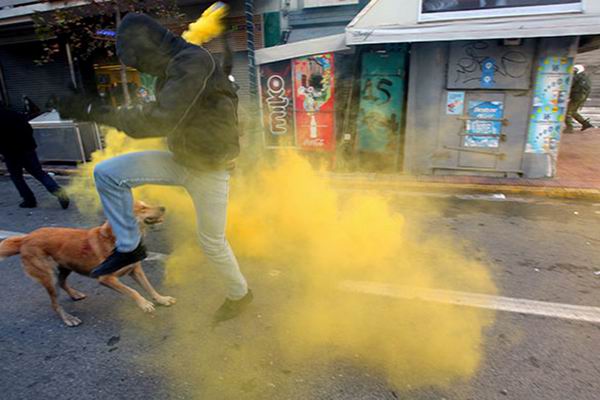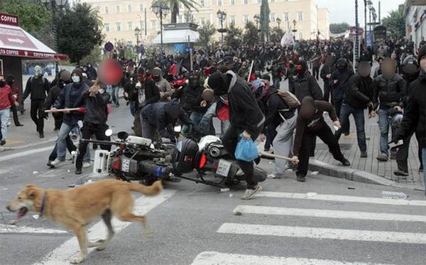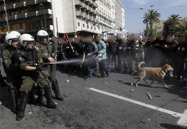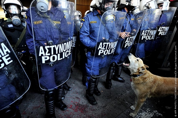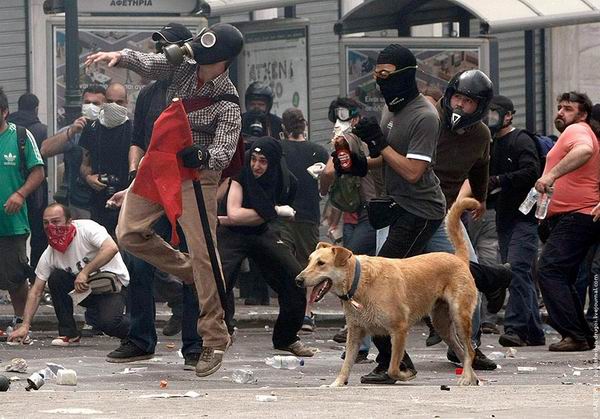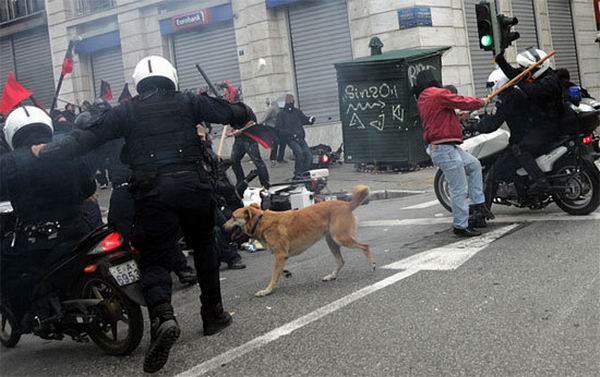 Читал новости про беспорядки в Греции и наткнулся на интересные фотографии собаки, оказывается изображенная на этих фотках собака не просто собака, а местная знаменитость — бездомный пёс по имени Loukanikos (Сосиска, по-русски), который последние два года активно принимает участие в уличных акциях протеста и уже десятки раз запечатлен на фотографиях всех информационных агентств. На Facebook есть группа поклонников собаки под названием «Riot Dog», кто-то написал песню в её честь.