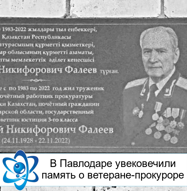 В Павлодаре установили мемориальную доску памяти почётного работника прокуратуры Республики Казахстан, государственного советника юстиции третьего класса, персонального пенсионера республиканского значения, почётного гражданина области Дмитрия Фалеева. Мемориальная доска появилась на доме по улице Ген. Дюсенова, 56, передает корреспондент Pavlodarnews.kz.