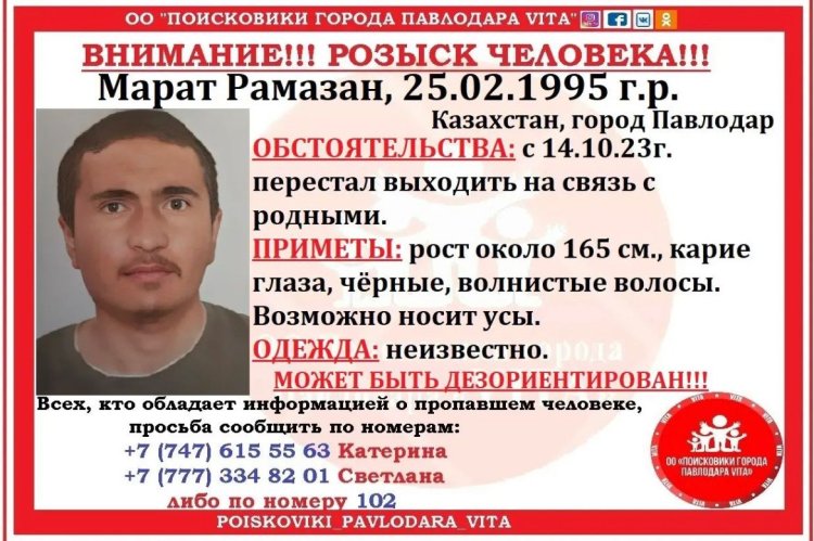 Городские новостиВ Павлодаре разыскивают двух без вести пропавших мужчин (02.11.2023, 08:52), просмотров: 2081Они пропали с разницей в две недели, передает корреспондент Pavlodarnews.kz. Ориентировки на обоих мужчин разместили в Instagram волонтеры павлодарского поискового отряда «VITA». Первым пропал 28-летний Марат Рамазан. Павлодарец перестал выходить на связь с родными 14 октября этого года. Его приметы: рост около 165 сантиметров, глаза карие, волосы черные, волнистые, возможно, носит усы. Может быть дезориентирован.