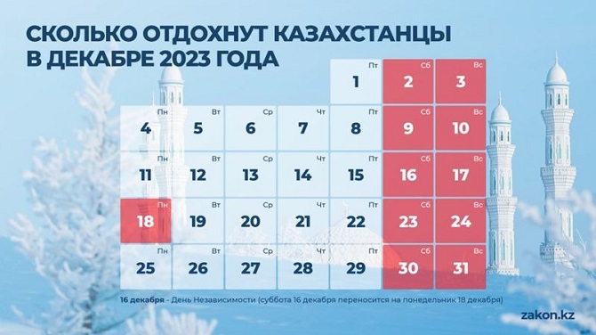 Казахстанские новостиСколько дней казахстанцы отдохнут в декабре 2023 года (07.11.2023, 11:21), просмотров: 1940В декабре в Казахстане традиционно отмечается День Независимости. В этом году День Независимости – 16 декабря – выпадает на субботу, это значит, что у казахстанцев появится дополнительный выходной в понедельник, сообщает Zakon.kz. Таким образом, казахстанцы на День Независимости отдохнут: — при пятидневной рабочей неделе: 16, 17, 18 декабря; — при шестидневной рабочей неделе: 16 и 17 декабря. Всего на декабрь приходится 11 выходных и 20 рабочих дней. Последние новости: