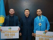 Асаин Байханов пожелал спортсмену не останавливаться на достигнутом результате, успешно выступить на новых предстоящих международных стартах и вручил денежный сертификат на 500 тысяч тенге. Также сертификат на 300 тысяч тенге получил тренер, подготовивший чемпиона - Заирбек Абылкадыров.