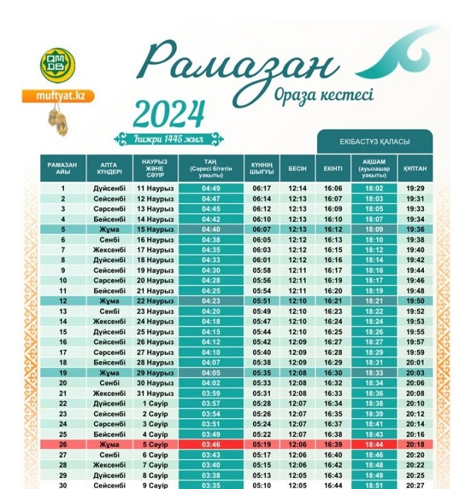 Городские новостиРамазан-2024: начало и конец поста в Павлодарской области (04.03.2024, 15:52), просмотров: 1562Священный месяц в этом году начинается 11 марта и завершится 9 апреля. В течение этого времени верующие мусульмане отказываются от любой еды и воды в светлое время суток – от утренней до вечерней трапезы, передаёт корреспондент Pavlodarnews.kz. В ночь на 10 апреля на закате верующие отметят праздник разговения — Ураза-байрам. Ночь предопределения в этом году выпадает с 5 на 6 апреля. Фитр-садака составляет 640 тенге. Кроме соблюдения ежедневного поста в месяц Рамазан, верующие мусульмане должны проявлять усердие в молитвах, а также совершать добрые дела. Ранее Духовное управление мусульман Казахстана опубликовало график поста месяца Рамазан на 2024 год в Павлодаре, Экибастузе и Аксу. Последние новости: