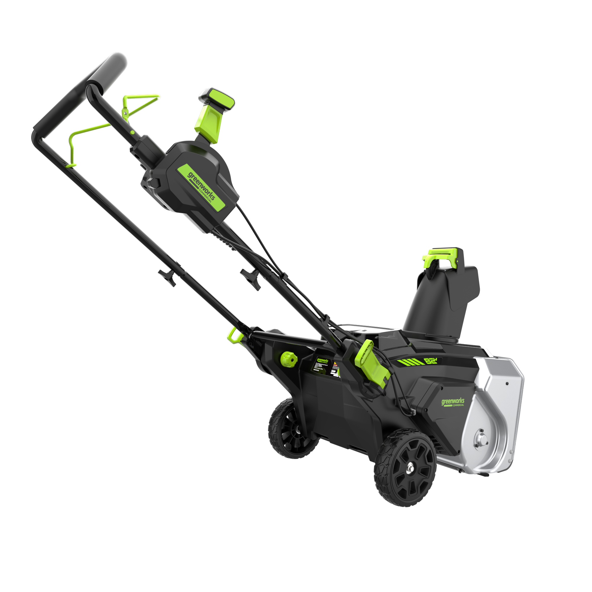 Направление выброса настраивают с помощью вращающейся рукоятки, расположенной под основной рукояткой управления. Диапазон углов поворота жёлоба составляет 180 градусов. Высоту выброса настраивают вручную, поднимая или опуская козырёк дефлектора на нужный угол (здесь диапазон регулировки составляет 45 градусов). Новый инновационный снегоуборщик от Greenworks –
