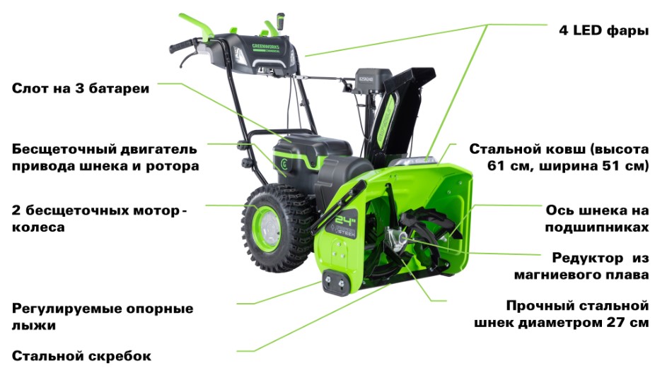 Благодаря системе Zero Turn, снегоуборщик легко разворачивается на месте, а наличие трех скоростей вперед, одной назад и нейтральной передачи обеспечивает маневренность. Широкие колеса с мощным протектором помогают преодолевать заснеженные участки, а задняя передача выручает в случае, если аппарат застрянет. Для работы в условиях недостаточной освещенности предусмотрены яркие светодиодные фары. Машина рассчитана на долгую работу благодаря трем аккумуляторным слотам с функцией автопереключения. При глубине снежного покрова 10 см очищаемая площадь на одном заряде составляет около 275 м² при использовании аккумуляторов 5 Ач и до 440 м² с батареями 8 Ач. Управление выбросом снега организовано просто и удобно. Угол выброса регулируется в пределах от 0° до 80° рычагом на консоли управления, а направление выброса можно изменять в пределах 200° с помощью рычага под панелью оператора. Металлический шнек с сугроборезами справляется даже с плотным слоем снега, превращая уборку в эффективный процесс. Технические характеристики● Максимальная мощность: 5200 Вт (7 л.с.) ● Ширина захвата: 61 см ● Высота захвата: 51 см ● Дальность выброса: до 15 м ● Скорости: 5 скоростей вращения шнека; 4 скорости движения (3 вперед, 1 назад) ● Совместимость аккумуляторов: Три слота с автопереключением (рекомендуется 8 Ач) ● Вес: 80 кг (без аккумуляторов и зарядного устройства) ● Защита от воды: Класс IPX4 ● Очищаемая площадь на одном заряде: до 275 м² (3×5 Ач) или до 440 м² (3×8 Ач) ● Освещение: Светодиодные фары (2 на ковше, 2 на панели управления) О компании Greenworks Greenworks – один из мировых лидеров на рынке аккумуляторной садовой техники и электроинструмента. Greenworks производит технику будущего без бензина и проводов, предлагает широкий ассортимент инновационного инструмента для дома и сада – цепные пилы, триммеры, газонокосилки, воздуходувы, кусторезы, мойки, снегоотбрасыватели, дрели, шуруповерты, перфораторы и многое другое. Преимущества аккумуляторной техники от Greenworks очевидны: мощность, экологичность, низкий уровень шума, отсутствие выхлопных газов, быстрый запуск и удобство использования. Хватит заправлять! Пора заряжать! Последние новости: