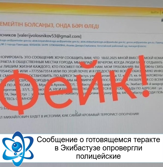 Городские новостиСообщение о готовящемся теракте в Экибастузе опровергли полицейские (18.02.2025, 11:56), просмотров: 1170В рассылаемом письме указывается, что 18 февраля вечером в Экибастузе готовится теракт. Произойдет это в людных местах. В УП Экибастуза информацию назвали фейковой, передает irbistv.kz. Информация о фейке появилась на официальных страницах УП Экибастуза и городского отдела образования в Instagram. Письмо направили в акиматы и суды Павлодарской области. В нем некий мужчина предупреждает, что со своей командой готовит бомбы. — Мы нападем вечером, когда люди будут отдыхать и развлекаться, — говорится в электронном письме. Автор, при этом, требует с ним связаться. Информацию прокомментировали полицейские. — Данная информация является фейковой. Полиция Экибастуза просит доверять только официальной и проверенной информации. Вместе с тем предупреждаем, за распространение недостоверной информации предусмотрена уголовная ответственность, — сообщили в УП города Экибастуза. Источник: Ирбис TV Последние новости: