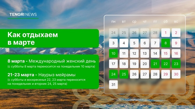 Казахстанские новостиСколько дней отдохнут казахстанцы в марте 2025 года: календарь (24.02.2025, 17:51), просмотров: 2247Первый месяц весны принесет казахстанцам не только долгожданное тепло и солнечные дни, но и дополнительные выходные, передает Tengri Life. В марте 2025 года жители нашей страны отметят сразу два государственных праздника: Международный женский день (8 марта) и Наурыз мейрамы (21–23 марта). В связи с переносами выходных казахстанцы получат больше дней для отдыха. Сколько дней отдохнут казахстанцы в марте — При пятидневной рабочей неделе — 14 выходных дней. — При шестидневной рабочей неделе — 10 выходных дней. Как отдыхаем на 8 Марта в 2025 году Международный женский день (8 марта) выпадает на субботу. По правилам переноса выходных дополнительный день отдыха назначается на понедельник, 10 марта. График выходных: — при пятидневной рабочей неделе: 8, 9 и 10 марта — три дня отдыха подряд; — при шестидневной рабочей неделе: 8 и 9 марта — выходные, но 10 марта (понедельник) уже рабочий день. Как отдыхаем на Наурыз в 2025 году Наурыз мейрамы традиционно отмечается с 21 по 23 марта. В 2025 году эти дни выпадают на пятницу, субботу и воскресенье, поэтому выходные переносятся на 24 и 25 марта (понедельник и вторник). График выходных: — при пятидневной рабочей неделе — пять дней отдыха подряд — с 21 по 25 марта; — при шестидневной рабочей неделе — выходными будут 21, 22, 23 и 24 марта. Во вторник, 25 марта, придется вернуться к работе. Последние новости: