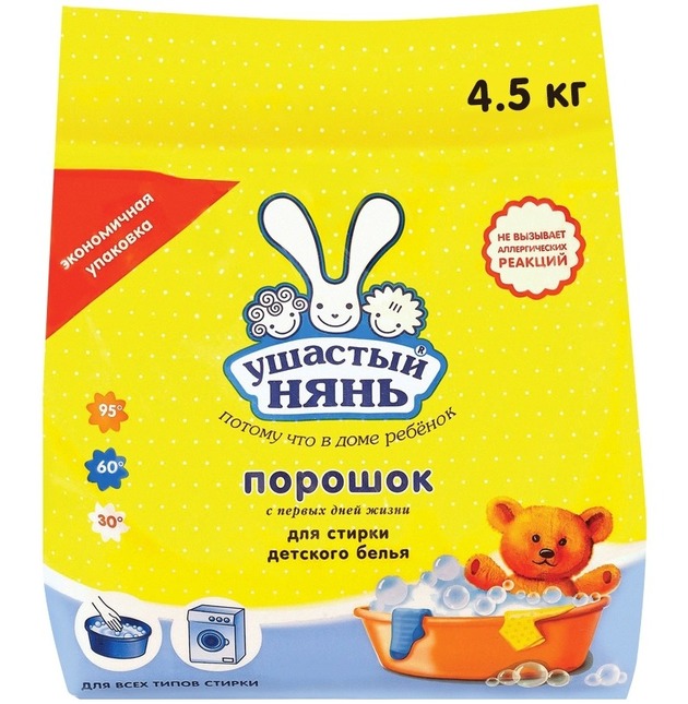 Преимущества порошка «Ушастый нянь»Среди большого числа специализированных продуктов именно этот бренд стабильно пользуется спросом у родителей. Причины кроются в удачном сочетании состава и удобства использования. В составе отсутствуют фосфаты и оптические отбеливатели, вместо них используется натуральное мыло, подходящее даже для новорождённых. Основные преимущества порошка: