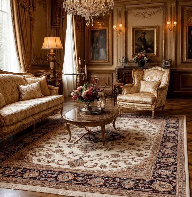 Преимущества классического стиля в интерьере Классический стиль всегда остаётся актуальным благодаря своей сдержанной красоте и гармоничному сочетанию элементов декора. Ковры в классическом стиле отличаются сложными узорами, традиционными орнаментами и выдержанной цветовой гаммой, которая легко вписывается в различные интерьерные решения — от роскошных гостиных до уютных кабинетов. Такой ковер становится центральным акцентом комнаты, объединяя мебель и аксессуары в единое целое. Классический стиль универсален — он не выходит из моды и легко адаптируется к современным тенденциям, благодаря чему ковер прослужит долгие годы и не потеряет своей привлекательности. Как выбрать материал классического ковра? Материал — один из ключевых факторов при выборе ковра. Для классических моделей часто используют натуральные волокна: