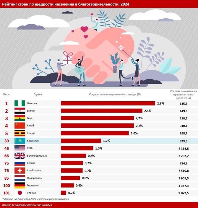 Казахстанские новостиКазахстан вошел в топ-30 самых щедрых стран мира по уровню благотворительности (15.10.2025, 19:33), просмотров: 588Казахстан занял 30-е место в мировом рейтинге щедрости населения, составленном международной организацией Charities Aid Foundation. Согласно исследованию World Giving Report – 2025, жители страны в среднем направляют на благотворительность 1,2% своего дохода – больше, чем в ряде развитых государств, передает Azattyq Rýhy со ссылкой на Ranking.kz. По данным исследования, проведенного организацией Charities Aid Foundation (CAF), Казахстан обогнал по уровню щедрости такие страны, как США, Великобритания, Германия и Нидерланды. Всего в рейтинге участвовало 101 государство, а основной показатель рассчитывался по доле благотворительных пожертвований от доходов населения. Самыми щедрыми оказались жители стран с невысокими доходами. Первые строчки рейтинга заняли Нигерия (2,8%), Египет (2,5%), Гана (2,2%), Уганда (2%) и Китай (2,2%). Германия оказалась предпоследней — жители страны жертвуют лишь 0,4% дохода, а Швейцария, несмотря на высокий уровень зарплат, заняла 76-е место с показателем 0,7%. Исследователи отметили любопытную закономерность: уровень щедрости чаще выше там, где доходы ниже. «Щедрость не всегда зависит от уровня благосостояния. В беднейших странах люди чаще помогают ближним, делятся временем, деньгами и участием», — говорится в отчете CAF. В Азии чаще всего оказывают помощь малоимущим (36%) и направляют средства на гуманитарные нужды (34%). В Европе на первом месте — поддержка детских и молодежных организаций, а в Северной Америке — помощь бездомным. Авторы доклада также подчеркнули, что мировой сектор благотворительности сталкивается с рядом вызовов — нехваткой финансирования, ростом конкуренции между фондами и увеличением операционных расходов. 80% опрошенных организаций сообщили хотя бы об одном серьезном препятствии для своей деятельности. Последние новости: