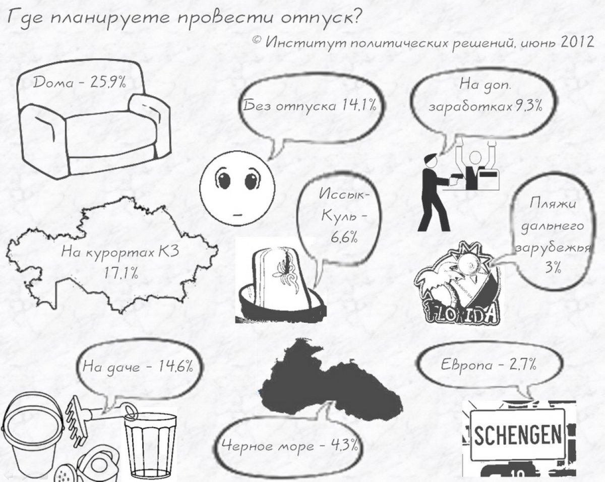 Большинство опрошенных казахстанцев проведут свой отпуск дома. Такой вывод сделал Институт политических решений (ИПР), который провел опрос среди 2307 казахстанцев в 16 городах Казахстана, передает Tengrinews.kz. "Большинство казахстанцев, опрошенных Институтом политических решений, проведут свой отпуск дома, на даче либо на одном из отечественных курортов. Выехать за границу этим летом планирует один из пяти респондентов, а у каждого четвертого отпуска как такового не будет вовсе", - сообщил Институт политических решений. ![]() Так, к домашнему отдыху склонились 25,9 процента опрошенных. 17,1 процента предпочтут отпуск на курортах Казахстана, 14,6 процента будут отдыхать на даче. Чуть больше 6 процентов поедут на Иссык-Куль, а 4,3 процента отправятся загорать на Черное море. Европу посетят 2,7 процента и 3 процента планируют поехать на пляжи дальнего зарубежья. Помимо этого, без отпуска останутся 14,1 процента и 9,3 процента предпочитают посвятить отпуск дополнительным заработкам.