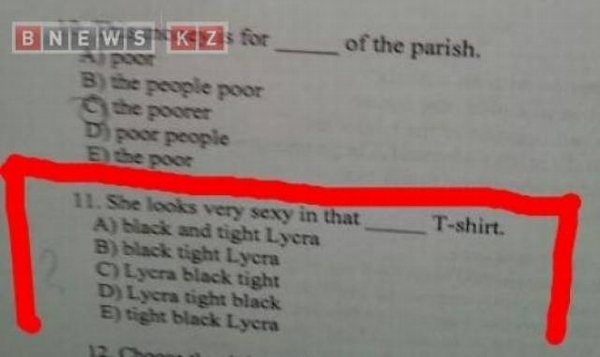 магистрантов, которые на днях сдавали экзамены в Астане. Задание заключалось в том, чтобы в правильном порядке расположить в предложении субъективные и объективные прилагательные. Сам вопрос, опубликованный в тесте на английском языке, звучит так: "Она выглядит очень сексуальной в …?" Далее следуют варианты ответов: "В черной обтягивающей футболе из лайкры", причем эти определения нужно расположить в правильном порядке. В итоге, большая часть студентов, ответить на этот вопрос затруднилась. За помощью в определении правильного ответа, абитуриенты обратились к организаторам тестирования - РГКП "Национальный центр тестирования". Специалисты НЦТ ситуацию прокомментировали оперативно. В официальном ответе говорится, что в толковых словарях В.К. Мюллера и Oxford Advanced learner dictionary слово "sexy" безобидно переводится как "привлекательный, обаятельный". И потому специалисты Центра не считают "данное слово неуместным или порочащим чью-либо честь и достоинство". ![]() Однако, обратившись к электронной версии этого же словаря Oxford Advanced learner dictionary (сайт www.oxfordlearnersdictionaries.com), подтверждения не обнаружено. На сайте сказано, что в отношении человека (of a person) слово sexy означает sexually attractive - сексуальная привлекательность. Нужно отметить, что появление в тесте при поступлении в магистратуру такого вопроса будущие магистранты считают забавным. Они говорят, что вызывает смущение лишь один нюанс – к чему спрашивать будущих ученых о том, "в какой одежде некая Она выглядит сексуальной", или "привлекательной"? А именно на последнем варианте перевода настаивает Национальный центр тестирования. Источник: Последние новости: