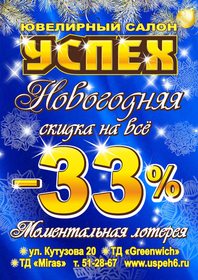 Городские новостиПраздничная скидка 33% от салона "Успех" (12.12.2013, 21:11), просмотров: 2816