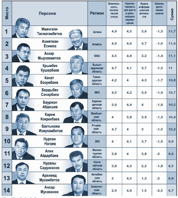 составило итоговый рейтинг эффективности. В прошлом месяце в корпусе акимов произошли изменения - своих портфелей лишились глава Северо-Казахстанской области Самат ЕСКЕНДИРОВ и Косман АЙТМУХАМЕТОВ, возглавлявший Акмолинскую область. Эти отставки не стали громом среди ясного неба, поскольку оба акима были постаутсайдерами рейтинга. В то же время замена слабых звеньев стала тревожным звоночком для тех, кому “не по Сеньке шапка”. В последнее время администрация президента делает серьезный акцент на регионы, проводя жесткий мониторинг работы областных властей. Первыми итогами этой работы стало то, что в Северный Казахстан направлен Ерик СУЛТАНОВ, а поднимать Акмолинскую область доверено Сергею КУЛАГИНУ. Оба только приступили к своим обязанностям, еще в стадии ознакомления с ситуацией, поэтому в майский рейтинговый замер они не вошли. Что же касается основного рейтинга, то здесь сложилась следующая картина. ![]() Группа лидеров Первое место вновь за столичным акимом Имангали ТАСМАГАМБЕТОВЫМ. В мае у него было много работы, так как в городе проводились крупные мероприятия: военный парад, подписание договора о создании Евразийского экономического союза. Все прошло, как говорится, без сучка и задоринки, тем самым, по отзыву одного из экспертов, “Имангали Нургалиевич еще раз показал, что не зря занимает кресло столичного градоначальника”. Вторую строчку подтвердил алматинский мэр. При этом респонденты отметили, что Ахметжан ЕСИМОВ чуть снизил обороты. Но несмотря на то что аким южной столицы не выходил за рамки протокола, это никак не отразилось на плотности его графика - в минувшем месяце он участвовал в культурных мероприятиях, запускал инфраструктурные проекты и, конечно же, катался на велосипеде. Значительно улучшил свои позиции рулевой Южно-Казахстанской области Аскар МЫРЗАХМЕТОВ - по итогам мая Аскар Исабекович поднялся сразу на три позиции. Эксперты отмечают, что в области один из самых лучших показателей индустриализации: введено 103 предприятия, из которых простаивает только одно производство. В активе акима также двукратный за последние три года рост внутренней валовой продукции. Не случайно в прошлом месяце президент Назарбаев записал в “похвальный лист” Мырзахметова очередную положительную оценку его работы. На четвертой позиции расположился аким Кызыл-ординской области Крымбек КУШЕРБАЕВ. В минувшем месяце Крымбек Елеуович произвел кадровые изменения в местных органах власти, посетил несколько районов области и в целом продолжил кипучую работу. Один из экспертов, говоря о встрече г-на Кушербаева с бывшим премьер-министром Великобритании Тони Блэром, заметил, что акиму “явно тесно в своей нынешней должности”. Группу лидеров замкнул аким Павлодарской области Канат БОЗУМБАЕВ, который продолжает “врастать” в регион. Первый срез итогов его работы будет получен, когда на Павлодарщину прибудет с рабочим визитом глава государства. Местные власти уже готовятся держать ответ перед президентом. Основная группа Лидерство в этой группе у акима Восточно-Казахстанской области Бердыбека САПАРБАЕВА. Следом идет глава Карагандинской области Бауржан АБДИШЕВ, который продолжает оставаться главной медийной звездой среди акимов. Ухудшились позиции акима Атырауской области Бактыкожи Измухамбетова, которого в мае 