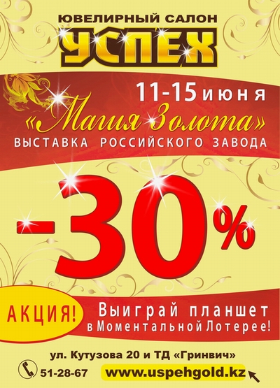 цепей. Прекрасная возможность купить российское золото со скидкой 30%! Выставка проходит в ювелирном салоне «УСПЕХ» по ул. Кутузова 20 до 15 июня. Новинки 2014 года уже на прилавках! Всё лучшее для вас! Приобретая у нас ювелирные украшения, Вы можете быть уверены в том, что все изделия прошли через российскую пробирную палату, имеют все необходимые клейма и очень долго будут радовать Вас! Помните! Качественные ювелирные изделия из российского золота и серебра от салона "УСПЕХ" - это не только выгодное вложение денег, но и лучший подарок на все времена... Ждём вас по ул. Кутузова 20. Заходите в наш новый интернет-магазин www.uspehgold.kz Звоните! 8(7182) 512867 ![]() ![]() Последние новости: