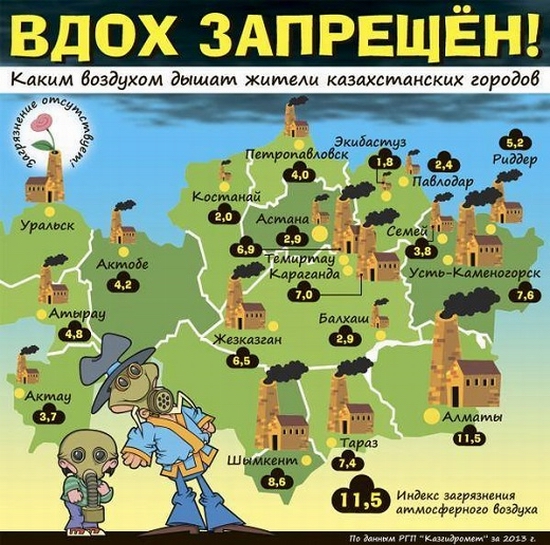Самым чистым городом Казахстана стал Уральск, там уровень загрязнения воздуха практически равен нулю, пишет газета "Время". Журналисты газеты на основе данных Казгидромет за 2013 год составили инфографику, согласно которой самым чистым городом Казахстана является Уральск, а самым грязным - Алматы. Уровень загрязнения воздуха в Алматы почти в 4 раза выше чем в столице республики Астане. Также загрязненными городами являются Караганда, Шымкент, Тараз и Усть-Каменогорск. ![]() Источник: Последние новости: