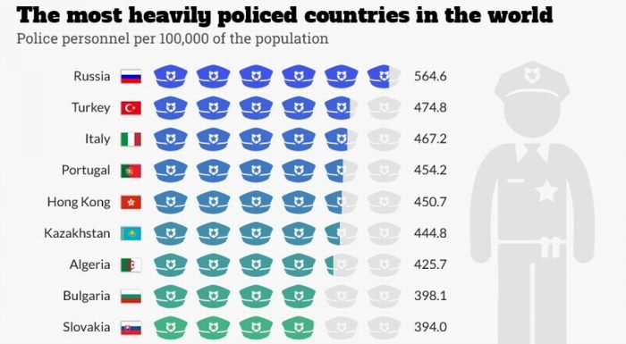 попал в ТОП-10 стран по числу полицейских на душу населения. Такие