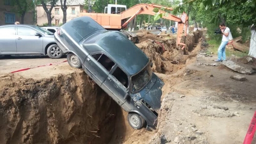 Павлодаре автомобиль «Волга» провалился в двухметровую яму по улице