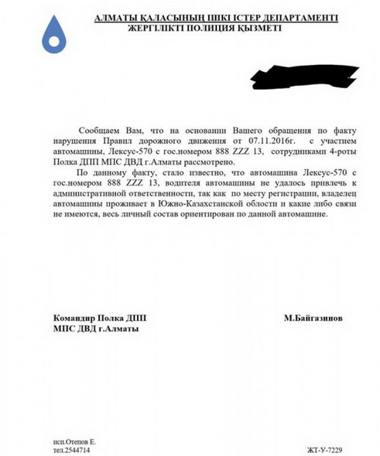 Позже Мухамади обратилась в полицию с заявлением о нарушении, на что получила не совсем внятный ответ. В полиции ей официально сообщили, что по данному факту "водителя авто не удалось привлечь к административной ответственности, так как по месту регистрации, владелец авто проживает в ЮКО и какие-либо связи не имеются, весь личный состав ориентирован по данной автомашине". (Орфография и пунктуация сохранены - ред.)