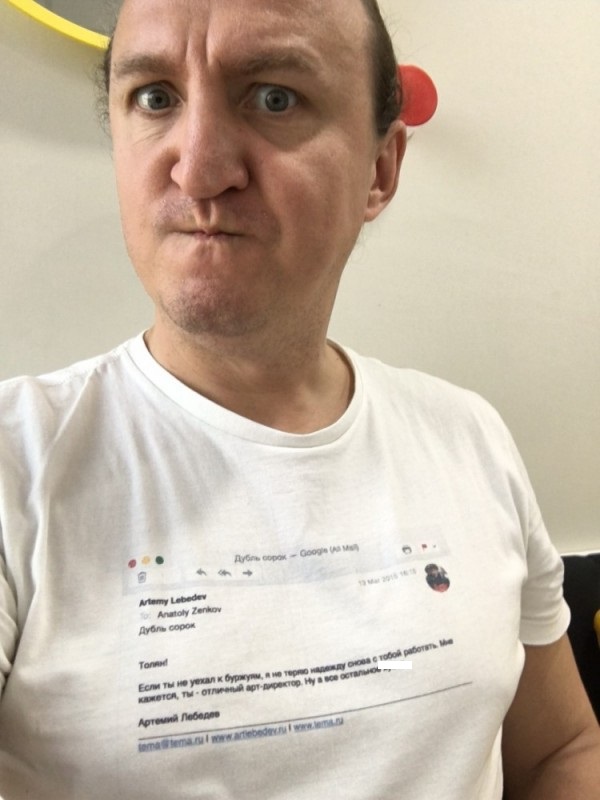 После очередного приглашения дизайнер по прозвищу Бача (Александр Зенков) попросил разрешения сделать себе футболку с текстом электронного письма Лебедева. И теперь носит ее. "Дубль 40. Толян, если ты не уехал к буржуям, я не теряю надежду снова с тобой работать. Мне кажется, ты - отличный арт-директор", - гласит надпись на футболке.