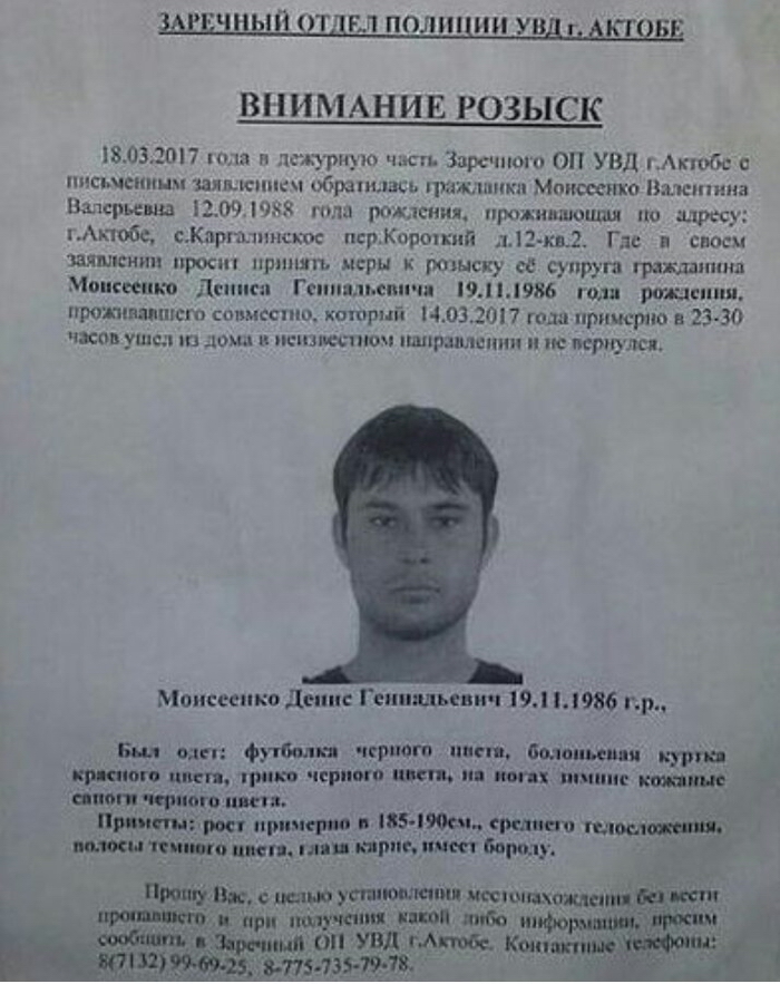 Денис Моисеенко пропал 14 марта 2017 года. Он вышел из дома в селе Каргалинское в 23:30 и не вернулся. Телефон мужчины не отвечал, а потом и вовсе стал не доступен. На следующий день супруга через соцсети попросила актюбинцев подключиться к поиску мужа, а 18 марта обратилась с заявлением о поисках в полицию. 26 марта мужчину нашли мертвым на балконе одной из квартир многоэтажки в селе Каргалинское. Пресс-служба ДВД сообщила, что Денис Моисеенко умер насильственной смертью. Подозреваемый в убийстве, 43-летний актюбинец, уже задержан. Он водворен в изолятор временного содержания. Полиция продолжает расследование. Назначена судебно-медицинская экспертиза. Начато досудебное производство по статье «Убийство». ![]() Автор: Мария Кравц Мой город Последние новости: