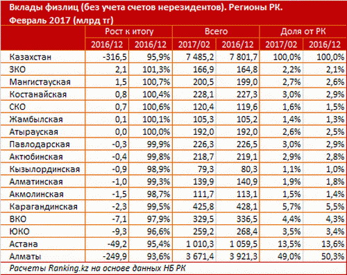 На втором месте расположен Хоум Кредит - прирост с начала года составил 4,6 миллиарда тенге. Объем розничных вкладов составил 37,5 миллиарда тенге, доля от Казахстана выросла с 0,4 процента до 0,5 процента. Замыкает ТОП 3 - Kaspi Bank. Объем розничных вкладов увеличился за январь-февраль 2017 года на 4,1 миллиарда тенге. ![]() В региональном разрезе только пять областей показали прирост депозитов физических лиц за январь-февраль 2017 года. Лидирует Западно-Казахстанская область, прирост за два месяца составил 2,1 миллиарда тенге, до 166,9 миллиарда тенге, доля области увеличилась с 2,1 процента до 2,2 процента.