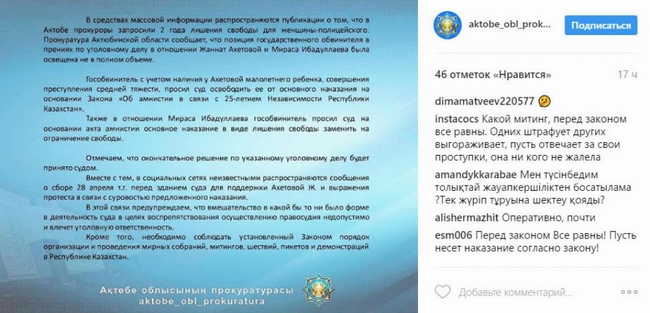 Призывы устроить возле здания Актюбинского городского суда пикет или митинг в поддержку сотрудницы дорожно-патрульной полиции Жаннат АХЕТОВОЙ стали распространяться в социальных сетях в четверг, 27 апреля. Недовольные горожане призывали таким образом помочь женщине, обвиняемой в превышении служебных полномочий. Напомним, что она пострадала из-за желания выручить знакомую, нарушившую правила дорожного движения, которую остановил инспектор дорожной полиции Мирас ИБАДУЛЛАЕВ. После того как он составил протокол, нарушительница позвонила Ахетовой, и та по дружбе пошла на преступление. Согласно материалам следствия, договорившись с Ибидуллаевым, женщина-полицейский заменила заполненный бланк протокола липовым, но с тем же номером. Ахетова и Ибадуллаев в суде свою вину признали полностью, а одно из казахстанских электронных СМИ, показало сюжет с прений в суде, где прокурор говорил о наказании для Ахетовой. Но в сюжет попали лишь те слова, где государственный обвинитель просит приговорить Ахетову к двум годам колонии. А следующей фразы, о том, что он просит применить к подсудимой амнистию и освободить её от наказания - нет. На столичном телеканале в видеосюжете так же не было сказано о том, что прокурор просил амнистировать сотрудницу полиции. Именно поэтому актюбинские пользователи соцсетей встали на защиту Ахетовой, сочтя наказание незаслуженно суровым. На прокуроров обрушилось цунами народного гнева. Зазвучали призывы в пятницу, 28 апреля, в день оглашения приговора, собраться у здания горсуда, выразить свой протест и «потребовать справедливого приговора». «Позиция государственного обвинителя в прениях по уголовному делу была освещена не в полном объёме», - написала в ответ в своем Инстаграме областная прокуратура. ![]() Прокуроры заявляют, что «вместе с тем, в социальных сетях неизвестными распространяются сообщения о сборе 28 апреля т.г. перед зданием суда для поддержки Ахетовой.Ж. и выражения протеста в связи с суровостью предложенного наказания». И просят актюбинцев воздержаться от собраний, назвав подобные действия вмешательством в действия органа, осуществляющего правосудие. Во избежание провокаций возле здания городского суда сегодня организовано дополнительное полицейское патрулирование. А сотрудникам полиции, которые дежурят в самом здании, дан приказ пресекать беспорядки. Автор: Дмитрий Матвеев Ratel.kz Последние новости: