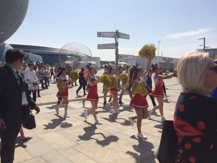 За ними следовали морские пехотинцы и барабанщики. Заключала пешую процессию группа чирлидеров - молодых девушек из группы поддержки, которые скандировали кричалку "USA - Kazakhstan". Дойдя до павильона Соединенных Штатов, марш завершился фотосессией для гостей выставки. В центре внимания был Дядя Сэм - персонифицированный образ Соединенных Штатов в традиционном цилиндре цветов американского флага. С ним охотно фотографировались дети и взрослые.