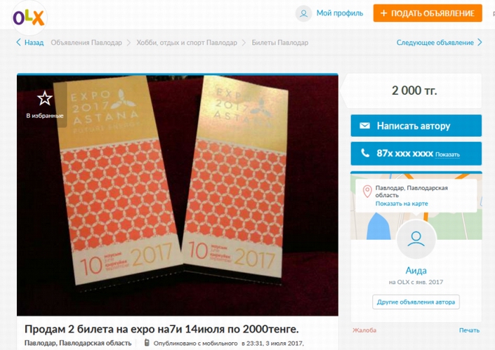 завалена предложениями о продаже билетов на ЭКСПО. Жители Павлодарской области только за последнюю неделю опубликовали более 50 объявлений, предлагая купить входные билеты на выставку по очень выгодным ценам. Вот, скажем, билеты на 7 и 14 июля можно купить по 2 тысячи тенге. - Брали за 4 тысячи тенге, сейчас по половине от стоимости продаем, - говорит Аида, опубликовавшая объявление. - На билете стоимость указана. Если вас волнует подлинность, там есть номер билета, и вы сможете ее проверить. Мы не обманываем, мы приличные люди, мама покупала на работе как работница бюджетной организации. ![]() Другой продавец готов расстаться с билетом на 7 июля за 3 тысячи тенге при стоимости в 4 тысячи. Юлия по телефону рассказала, что мама работает в спортивной школе и там приобретала билет, но ехать в Астану не собирается. Билеты с открытой датой можно купить за 4 тысячи тенге при официальной стоимости 8 тысяч. С учетом того, что предложение превышает спрос, некоторые граждане отдают три билета по цене одного. Получается, власти сбыть билеты населению смогли, но заставить поехать людей на выставку не в силах. Подтверждением тому служат цифры, которые озвучили в акимате на прошлой неделе. По плану от Павлодарской области в Астану должны были поехать 100 тысяч человек. Разными способами жителям региона таки продали 80 тысяч билетов. Однако за месяц выставку посетили не больше 20 тысяч павлодарцев. Взять, к примеру, Баянаульский район. Здесь продали 3,5 тысячи билетов, а на выставке побывали не больше 400 человек. В других районах показатели еще хуже. Джамиля МАРИЧЕВА Ratel.kz Последние новости: