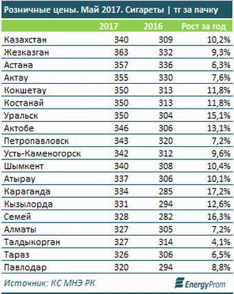 Enegryprom.kz. Как отмечается, табачные компании остаются в минусовой зоне - производство сигар и сигарет сократилось на 22 процента за 12 месяцев. К лету цены на сигареты по РК поднялись до 340 тенге за пачку. Больше всего среди крупных городов и мегаполисов РК платить приходилось курильщикам Жезказгана (363 тенге за пачку, +9,3 процента за год), Астаны (357 тенге, +6,3 процента за год) и Актау (355 тенге, +7,6 процента за год). На данный момент на обсуждении находится проект постановления правительства РК по поэтапному удорожанию сигарет. Согласно документу, каждые полгода минимальная стоимость сигарет будет повышаться на 20 тенге и с 1 января 2019 года составит 380 тенге. Предлагается установить минимальные розничные цены на 20 сигарет с фильтром, без фильтра и папиросы: 1) до 31 декабря 2017 года включительно в размере 320 тенге; 2) с 1 января 2018 года в размере 340 тенге; 3) с 1 июля 2018 года в размере 360 тенге; 4) с 1 января 2019 года в размере 380 тенге. По данным аналитиков, рост цен закономерен, учитывая регулярное повышение акцизов на табачную продукцию. В этом году по сравнению с 2016 годом они выросли на 24 процента - с 5 000 тенге за 1 000 штук до 6 200 тенге. В 2018 году ставки планируют поднять до 7 500 тенге, в 2019 году - до 8 700 тенге. От повышения цен ожидается как снижение интереса населения к табакокурению, что соответствует целям РК в области здравоохранения, так и увеличение денежных поступлений в бюджет. ![]() За январь-май было произведено лишь 5,1 миллиарда штук сигарет и прочих табачных изделий (22 процента). Для сравнения, показатели января-мая 2016 года демонстрировали годовое снижение к аналогичному периоду 2015 года на 5,9 процента. В многолетней динамике снижение объемов выпуска в отрасли наблюдается все последние годы, с незначительным приростом лишь по итогам прошлого года (+3,4 процента). Сокращение ожидаемо: Казахстан уже десять лет придерживается принципов Рамочной конвенции по борьбе против табака Всемирной ассоциации здравоохранения. Спад наблюдается и в денежном выражении - так, за январь-май объемы производства табачных изделий составили 26,06 миллиарда тенге, на 20,2 процента меньше, чем в аналогичном периоде годом ранее. Под давлением антитабачной кампании казахстанские производители вынуждены искать альтернативные варианты развития. Примечательно, что по данным за четыре месяца текущего года сократилось не только производство, но и спрос: так, реализация сигарет и папирос на внутреннем рынке снизилась на 14 процентов за год. Импорт тоже в минусе - на 14,9 процента к прошлогодним показателям. В стране принимаются дополнительные меры, чтобы не допускать даже скрытую рекламу табака и алкоголя. Так, в Мажилисе Парламента в июне был рассмотрен в первом чтении законопроект "О внесении изменений и дополнений в некоторые законодательные акты РК по вопросам рекламы". По словам министра национальной экономики Тимура Сулейменова, введена ответственность за рекламу в форме проведения различных мероприятий, в том числе розыгрышей призов, лотерей, направленных на стимулирование спроса и интереса к табаку и табачным изделиям и алкогольной продукции. Tengrinews Последние новости: