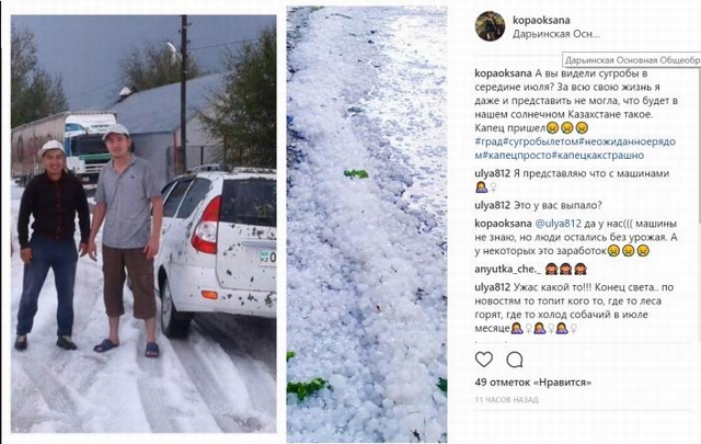 Необычное природное явление погрузило Западно-Казахстанскую область во временную зиму. Жители региона публикуют фотографии слоя льда, покрывшего землю после выпадения града, передает корреспондент Tengrinews.kz. По данным РГП "Казгидромет", град был зафиксирован в Дарьинске, он был диаметром восемь миллиметров, местами, по сведениям очевидцев, в поселке град достигал двух сантиметров. Но так как град выпадал в течение часа (с 17 до 18 часов местного времени), высота слоя выпавшего града составляла местами девять-десять сантиметров. Общее количество осадков за сутки 11 июля составило 99,6 миллиметра. Жители Уральска и Дарьинска активно публикуют фотографии в соцсетях. "А вы видели сугробы в середине июля? За всю свою жизнь я даже и представить не могла, что будет в нашем солнечном Казахстане такое", - пишет пользователь Instagram под ником @kopaoksana. ![]() Местные жители опасаются за урожай, побитый градом и оставшийся подо льдом. ![]() По данным синоптиков, 11 июля Западно-Казахстанская область находилась под влиянием высотной барической ложбины, по тыловой части которой на Казахстан поступал холодный и влажный воздух с районов Карского моря, что и вызвало обострение холодного арктического фронта. Образовался частный циклон, замкнутая область низкого давления. "Вероятней всего, облако достигло больших высот, примерно девять-десять километров, в верхней части облака произошло замерзание водяных капель и они с большой скоростью в виде льда выпадали на землю, не успев растаять. Прохождение активного холодного фронта и влияние высотного циклона и вызвало град в районе Уральска", - сообщили в пресс-службе РГП "Казгидромет". ![]() "В Уральске временная зима", - пишет пользователь Instagram под ником @damiraidarov. Некоторые местные жители утверждают, что это снег, однако синоптики заверили, что в Уральске выпал мелкий частый град. Автор : Мейирим Смайыл Tengrinews Последние новости: