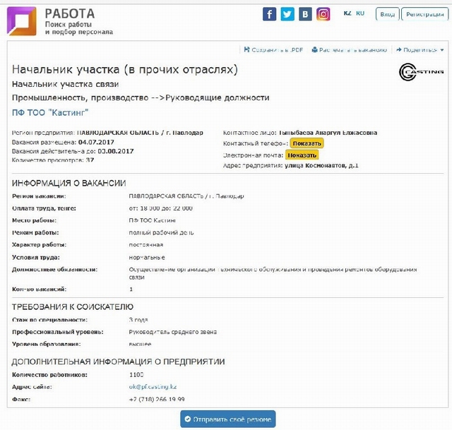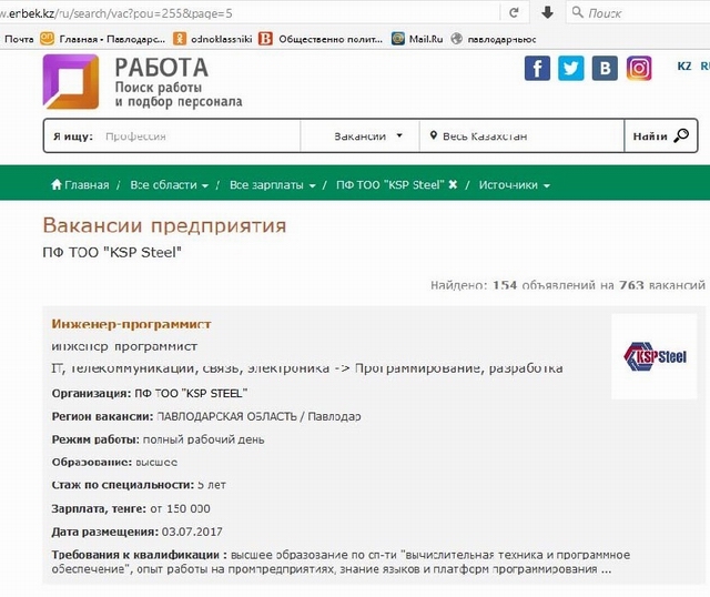 Номер шесть в списке 50 богатейших казахстанских бизнесменов, по версии Forbes.kz, Рашит САРСЕНОВ (720 миллионов долларов) ищет на руководящую должность на одно из своих предприятий в Павлодаре начальника участка связи с зарплатой от 18 до 22 тысяч тенге. Специалист должен быть с высшим образованием и опытом, при этом работать за эти деньги целый день. Информацию об этом можно увидеть в базе вакансий на электронной бирже труда, куда безработных граждан Казахстана сегодня активно отправляет прокурор Павлодарской области Серик КАРАМАНОВ. То есть эта база не филькина грамота, поскольку пользуется полным прокурорским доверием. На днях пресс-служба прокуратуры сообщила о том, что надзорный орган по инициативе Серика Караманова целый год мониторил центры занятости региона и обнаружил тысячи скрытых вакансий. В результате количество уведомлений о вакансиях увеличилось почти втрое - с 6165 до 16 696. - Также прокуроры установили, что информация о вакантных местах обновлялась только на бумажных носителях и стендах, поэтому жители одной области не имели возможности знать о существующих вакансиях в других регионах, - рассказала пресс-секретарь прокуратуры Аида СЫЗДЫКОВА. - Теперь вакансии можно посмотреть онлайн в любом из регионов на сайте enbek.kz. И что же мы видим, зайдя на этот сайт? Республиканским лидером по свободным вакансиям здесь значится павлодарский филиал ТОО “KSP Steel”, который 3 июля разместил 154 объявления на 763 вакансии (см. скриншот). ![]() Причем речь не идет о чернорабочих или, скажем, дворниках. На первом казахстанском предприятии по производству стальных бесшовных труб для нефтегазовой отрасли, судя по представленным на сайте вакансиям, нет инженера-диагностика и инженера-инспектора, инженера-программиста и инженера-конструктора, инженера по охране труда и технике безопасности, инженера по качеству и главного инженера проекта. Не говоря уже о всевозможных операторах, начальниках участков, отделов и бюро, машинистах, мастерах, ковшевых и кабель-спайщиках, лаборантах и контролерах и прочих работниках исключительно с высшим либо профессионально-техническим образованием и стажем. По нашим данным, штат работников компании составляет 4 тысячи человек. То есть выходит, что серьезному промышленному предприятию не хватает почти 20 процентов высококвалифицированных кадров. Как с таким недобором может работать компания, чья продукция согласно официальной информации используется при строительстве трубопроводов, на объектах нефтегазодобывающих и геолого-разведочных компаний, машиностроительными и промышленными предприятиями Казахстана и экспортируется в страны СНГ (Россия, Азербайджан, Туркменистан) и государства дальнего зарубежья, в том числе США? В акимате области заверили, что никогда о кадровой проблеме в ПФ ТОО “KSP Steel” не слыхали. Заместитель генерального директора филиала Илья ЛОБАШЕВСКИЙ заявил мне по телефону то же самое, что, мол, нет у них никаких 763 вакансий, а сколько есть, он сказать не готов, но проблем с кадрами предприятие не испытывает. Об этом, к слову, можно догадаться и по зарплате, которая значится на сайте enbek.kz. Инженеру по качеству предлагается 92 тысячи тенге, главному инженеру проекта - 75 тысяч, машинисту тепловоза - 60 тысяч. Какой высококвалифицированный специалист со стажем пойдет работать за такие деньги? Т