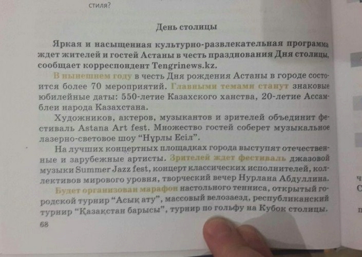 "Здесь указана информационная заметка. Дан текст, который помещен в главе, взятый с интернет-ресурса. Выделенные словосочетания указывают, что слова характерны для публицистического стиля. Кроме того, здесь отрабатывается тема праздников", - поясняет эксперт. В министерстве подчеркнули, что подобная практика заданий будет и дальше применяться в новых учебниках. Также было отмечено, что вышеупомянутый учебник будет служить учебным пособием, несмотря на критичное к нему отношение. "Мы живем в век информационных технологий, и отрывать школу абсолютно от той окружающей действительности, хотим мы или не хотим, все равно обязаны", - заявила член экспертной комиссии Тамара Хоменко. Tengrinews Последние новости: