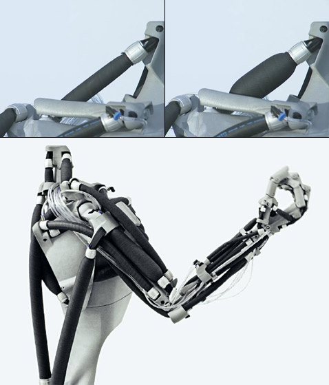 А приводят эту систему в движение Fluidic Muscle числом 32 штуки! Это приблизительно вдвое меньше, чем в настоящей руке и плечевом поясе, но всё равно — впечатляет.