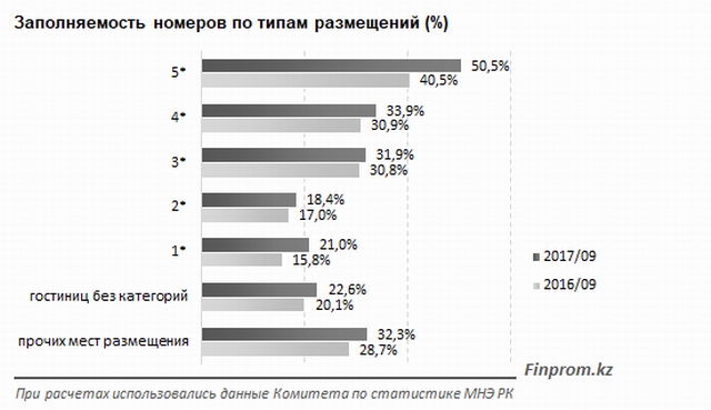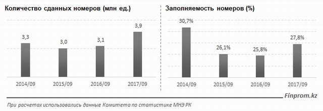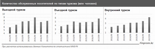 За 9 месяцев страну посетило рекордное число иностранных туристов. За год число посетивших РК выросло на 18%. Аналогичная активность наблюдается и в секторе внутреннего туризма - за год число граждан, отдыхающих внутри страны, выросло на 25% Казахстан укрепляет свои позиции на карте международного туризма, за 9 месяцев текущего года республику посетило рекордное число иностранных туристов - 5,8 миллиона человек. В течение предыдущих 5 лет показатель въездного туризма не превышал (или незначительно превышал) отметку в 5 миллионов человек. По сравнению с численностью посетивших Казахстан в январе-сентябре 2016 года уровень в этом году вырос на 18,1%, или на 894 человека. Интерес иностранцев к РК стимулирует и самих казахстанцев, все больше граждан выбирает отдых внутри страны, чем выезд за ее пределы. По итогам 9 месяцев текущего года число внутренних туристов достигло 4,4 миллиона человек, что на 25% больше показателей годом ранее. Как и в секторе въездного туризма, в этом году внутренний турпоток показал самый резкий рост за всю историю 2010-х годов. ![]() Текущая турактивность повышает спрос на услуги казахстанских гостиниц, хостелов и других мест размещений, хотя до полной загрузки или овербукинга еще далеко. Всего за январь-сентябрь текущего года в местах размещения разного уровня классов(звезд) было сдано 3,9 миллиона номеров, или на 23,7% больше, чем за аналогичный период прошлого года. В результате текущий уровень заполняемости номеров оценивается в среднем в 27,8%. Это выше уровня годом ранее или два года назад (25,8% и 26,1%, соответственно), однако ниже показателей 2014 года, до периода резкого ухудшения состояния экономики и падения реальных доходов населения. Самая лучшая ситуация с заполняемостью номеров - в дорогих гостиницах и отелях 5*. По оперативным данным, в этом году в пятизвездочных местах размещения было заполнено порядка 50,5% номеров против 40,5% годов ранее. Для сравнения, в 4*-ных отелях уровень заполняемости составил 33,9%, в 3* - 31,9%, 2* - 18,4%, 1* - 21%, в гостиницах без категорий - 22,6% за январь-сентябрь 2017 года. ![]() Рост активности в турбизнесе зафиксировал также опрос Комитета по статистике МНЭ РК 184 туристских организации. Так, результаты обследования турфирм в 3 квартале 2017 года показали повышение экономической конъюнктуры по сравнению с ситуацией годом ранее. Участники опроса указали, что за год увеличилось число туристов, выезжающих из страны и путешествующих внутри страны, а въезжавших в страну из ближнего и дальнего зарубежья – уменьшилось. Соответственно, в обследованных туристских организациях наблюдалось увеличение объема оказанных услуг - баланс изменения оценок показателя увеличился по сравнению с 3 кварталом 2016 года на 17 процентных пункта и составил (18%). В 3 квартале 2017 года баланс изменения оценок прибыли по сравнению с уровнем годом ранее увеличился на 11 процентных пункта и составил (10%). При этом большинство руководителей (69%) оценили экономическую ситуацию своей организации как «удовлетворительную», 9% - как «хорошую» и 15% - как «плохую». ![]() Последние новости:
