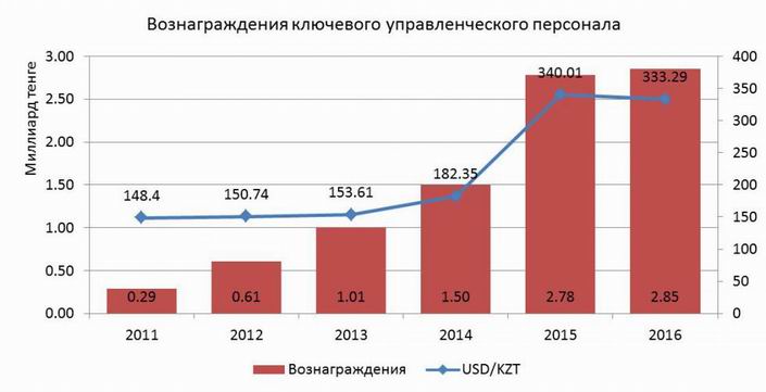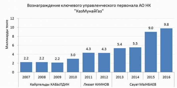 гиганту Shell. В прошлой публикации мы рассказали об убытках, которые приносит КМГ ее операционная деятельность. При такой работе, как выясняется, для Казахстана было бы намного лучше, если бы такую нацкомпанию вообще не создавали. Напомним, что в операционную деятельность КМГ входит участие в государственной политике в нефтегазовой отрасли, представление государственных интересов в контрактах на недропользование, корпоративное управление и мониторинг деятельности дочерних компаний. Десятки тысяч простых работников, входящих в структуры КМГ добывают ежегодно свыше 22 млн тонн нефти, но в последние годы эта деятельность почему-то не приносит прибыли. К 2015 году выяснилось, что КМГ набрал долгов на $18 млрд, а все его заработки уходят на погашение процентов по кредитам. Вот уже более десяти лет тянется эпопея с приобретением KMG International румынских нефтеперерабатывающих заводов. На эту затею было потрачено свыше $3 млрд. При этом переработка нефти и производство нефтепродуктов на модернизированных за сотни миллионов долларов румынских НПЗ является убыточной. Прибыль этой весьма дорогостоящей для Казахстана компании приносит заурядная перепродажа нефти. Между тем, КМГ был вынужден продать большую часть акций KMG International китайской компании China Energy Company Limited за $680 млн, при этом денег мы до сих пор не увидели. По нашим подсчетам, если бы менеджеры КМГ не так активно занимались бы инвестиционной деятельностью за рубежом, не списывали бы десятки миллионов долларов на неудачные месторождения, не строили бы отелей за границей, курортов и не занимались созданием так называемых непрофильных активов, страна могла бы получать ежегодно от полутора триллиона тенге в виде налогов и других выплат от той нефти, которую добывает национальная компания. Но вместо этого мы только теряем деньги. Что бы ни делал нанятый в национальную компанию персонал, все его действия уже много лет ведут к убыткам. Более того, они даже проедают ту долю прибыли, которую по доверенности от правительства собирают с частных предприятий, добывающих нефть в Казахстане. Но на личном благосостоянии руководителей КМГ это никак не отражается. В национальной компании существуют «Правила оплаты труда членов Правления», согласно которым предусмотрены вознаграждения по итогам работы за финансовый год в зависимости от степени достижения руководящими работниками стратегических целей. Несмотря на то, что и в 2016 году национальная компания получила убыток от операционной деятельности, руководству были начислены рекордные вознаграждения -2,85 млрд тенге ($8,55 млн). При этом, согласно отчетности НК «КазМунайГаз», только $1,2 млн вознаграждений полагаются членам совета директоров, а оставшиеся $7,35 млн причитаются правлению «КазМунайГаза». Получается в среднем по $1 млн на каждого члена правления. Отметим, что сумма вознаграждения ключевому управленческому персоналу КМГ растет независимо от курса тенге и девальваций в стране. Начиная с 2011 года общая сумма вознаграждений выросла более чем в 4 раза (в долларовом эквиваленте) - с $2 млн до $8,55 млн. Как известно, в декабре 2011 года произошла трагедия в Жанаозене. Много месяцев простые нефтяники стояли на площади города, добивались увеличения выплат. По странному совпадению, в 2012 году вознаграждения топ-менеджерам «КазМунайГаза» стали увеличив