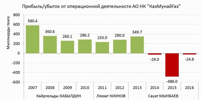 Например, независимые директора Питер ЛЕЙН, Фрэнк КУЙЛААРС и Кристофер УОЛТОН ежегодно получают в среднем не менее $250 тыс. каждый. С 2013 года, после утверждения новых «Правил оплаты труда членов правления», общая сумма вознаграждений превысила отметку 1 млрд тенге, а в 2016 году - 2,85 млрд тенге. До 2013 года независимые директора получали лишь по $100 тыс. в год. ![]() Всего за последние 10 лет ключевому управленческому персоналу АО НК «КазМунайГаз» было начислено свыше $250 млн. ![]() Особенно издевательски выглядят вознаграждения топ-менеджерам на фоне диаграммы с убытками. Как следует из диаграммы, когда в КМГ появились убытки, на поощрениях ключевому персоналу это мало повлияло. ![]() По состоянию на 31 декабря 2016 года правление АО «НК «КазМунайГаз» состояло из следующих членов: