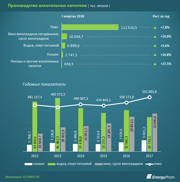 Реализация водки и ликероводочных изделий на внутреннем рынке страны выросла на 30 процентов, пишет Energyprom.kz. Рынок спиртного на подъеме: винокуры нарастили выпуск коньяка сразу на 16,8 процента за год, до 2,7 миллиона литров по итогам I квартала текущего года; производство водки увеличилось на 5,6 процента год-к-году, до 6,9 миллиона литров, ликеров - сразу на 27,5 процента, до 636,5 тысяч литров Рост наблюдается и в сегменте менее крепких напитков. Изготовление вин увеличилось на 10,8 процента, до 10 миллионов литров за январь-март 2018, пива - на 7,8 процента, до 112,5 миллиона литров. ![]() Начало года ознаменовалось взлетом спроса на алкоголь у казахстанцев: по итогам первых двух месяцев (январь-февраль 2018), реализация водки и ликероводочных изделий на внутреннем рынке страны выросла сразу на 30 процентов, вина - на 28,4 процента, пива - на 39,7 процента. В то же время, речь только об официально ввезенной или произведенной в РК алкогольной продукции. Что касается реальной картины - настоящие объемы "серого" рынка по факту неизвестны. Напомним, только по официальным данным КомСтата, согласно статистическим расхождениям в балансах в 2016 году, 20,3 процента водки и ликероводочных напитков и 20,5 процента вина (то есть каждая пятая бутылка в РК), могли относиться к незаконному импорту или производству. Эксперты же оценивают объемы "нелегалки" еще менее оптимистично. Так, аналитики Euromonitor International оценили объемы нелегальной водки в 50,3 процента от общего объема рынка в 2016 году. Расхождения в статданных также указывают на немалые объемы "левой" продукции на рынке. К примеру, по официальной статистике в 2016 году каждый казахстанец в среднем потратил на алкоголь за год всего 3175 тысячи тенге (или по 3476 тенге на душу населения в городской местности, и по 2772 тенге - в сельской) - это всего 0,7 процента от общего объема расходов одного среднестатистического казахстанца. То есть объемы затрат всех казахстанцев (по итогам 2016 года - 17,9 миллиона человек) на все спиртные напитки составили около 56,9 миллиарда тенге. Однако по совокупным данным балансов за 2016 год, реализация только лишь водки и ликероводочных напитков в РК уже составила как минимум 61,3 миллиарда тенге (объемы реализации на внутреннем рынке, помноженные на минимальную стоимость водки и крепких ликероводочных изделий на 2016 год - 1380 тенге за литр) - то есть как минимум на 7,8 процента больше. И это - без учета вина и пива, которых казахстанцам в 2016 году было продано 24,3 и 540 миллионов литров, соответственно. Аналитики отмечаются, что с "серым" алкоголем ведется активная борьба, эффективность которой, впрочем, пока неясна: нельзя наверняка утверждать, что рынок нелегального и небезопасного алкоголя сокращается. К примеру, председатель Комитета государственных доходов Минфина Ардак Тенгебаев рассказал, что в прошлом году были проведены проверки по 13 заводам этилового спирта и водки, а также по 84 оптовым реализаторам алкогольной продукции. По итогам проверок возбуждено 217 уголовных дел, пресечена деятельность 47 подпольных цехов. Из незаконного оборота изъято свыше 3,5 миллиона поддельных учетно-контрольных марок, 8,7 миллиона бутылок неучтенной алкогольной продукции и около 346 тысяч литров спирта. Кроме того, главный налоговик страны отметил, что именно с подакцизных товаров легче всего получить высокую маржу, и прежде всего это алког
