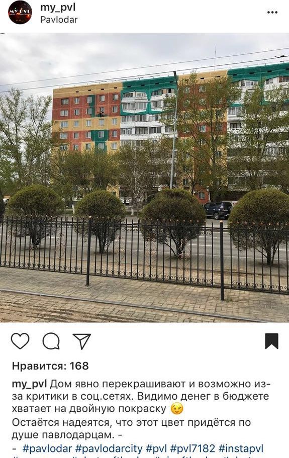 Об этом в ответ на официальный запрос сообщили в пресс-службе акимата Павлодара. - Касательно вопроса покраски дома по адресу Кутузова, 32 сообщаем, что подрядной организацией, осуществляющую покраску указанного дома, неправильно была выдержана цветовая гамма. В связи с чем, акиматом города была разработана единая цветовая концепция фасадов многоэтажных домов, в которой утвердили светлые, тёплые тона, - говорится в сообщении. Однако павлодарцы успели заметить ошибку подрядчиков и выложить фотографии наполовину зелёного дома в социальные сети. Группа @my_pvl разместила одну из них у себя на странице в Instagram, предположив, что работы осуществляются за счет городского бюджета. ![]() При этом, в акимате отмечают, что покраска домов выполняется подрядной организацией за счёт спонсорских средств. Отметим, красить жилые здания начали ещё в прошлом году, а в мае 2018 снова продолжили. На сегодняшний день в городе покрашено 26 домов. В планах ещё 32 многоэтажки украсят пастельные тона. На этом, как отмечается в ведомстве, работа не остановится. Покраску домов продолжат и в 2019 году. ![]() Тем временем, комплексное благоустройство Павлодара продолжается. Местных власти обратили внимание не только на многоэтажные жилые дома, но и занялись реконструкцией городского парка культуры и отдыха, а также возведением главной сцены на центральной Набережной. Автор: Маргарита Чудакова Последние новости: