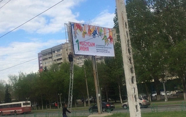 На баннере к празднику не было поздравлений, лишь констатация - «Международный день защиты детей», и дата – 1 июня. В русскоязычной версии все слова написаны правильно, но на казахском языке огромными буквами значилось – «1 масусым».