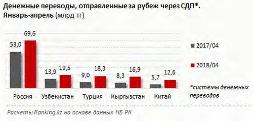 Наибольший объем переводов за январь-апрель 2018 года был отправлен в Россию - 69,6 миллиарда тенге, рост за год - на 31,2 процента, доля страны в общем объеме переводов снизилась с 45,5 процента до 43,8 процента. Следом идет Узбекистан, с объемом в 19,5 миллиарда тенге, рост за год на 39,9 процента, доля страны выросла с 11,9 процента до 12,3 процента.