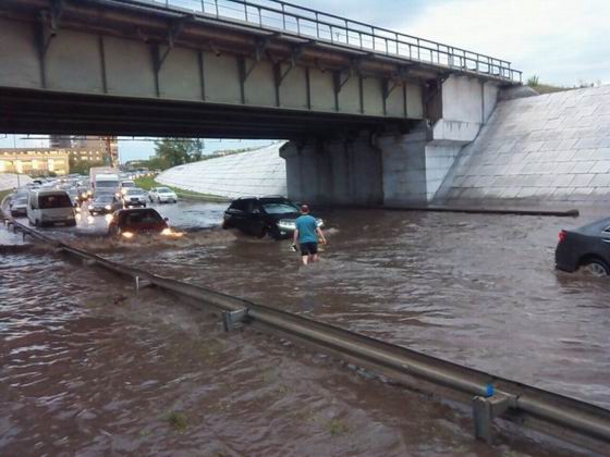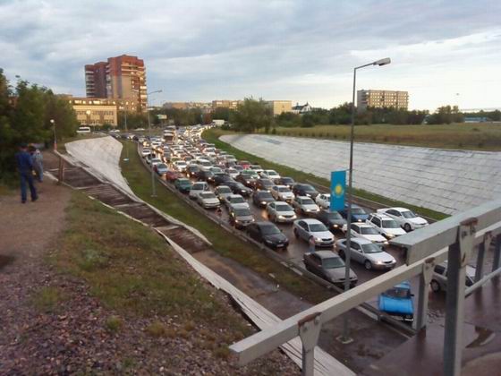 и град затопили магистральные пути Семея и стали причинами километровых