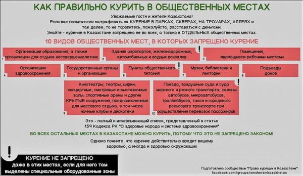 Имеется четкий перечень объектов, где курение запрещено либо допускается только в специально оборудованных местах. Таким образом, курение на улицах это, скорее, вопрос этики, нежели запретов, предусмотренных законодательством", - делает вывод адвокат. Продолжая изучение законодательства, Галиев отмечает, что в соответствии с пунктом 5 статьи 159 Кодекса о здоровье потребление табачных изделий запрещается в: - организациях образования, а также в организациях для отдыха несовершеннолетних; - организациях здравоохранения; - пунктах общественного питания; - кинотеатрах, театрах, цирках, концертных, смотровых и выставочных залах, на спортивных аренах и в других крытых сооружениях, предназначенных для массового отдыха, в том числе в ночных клубах, на дискотеках; - музеях, библиотеках и лекториях; - неустановленных местах в поездах и на судах морского и речного транспорта; - на борту воздушных судов, в салонах автобусов, микроавтобусов при осуществлении перевозок пассажиров, троллейбусов, такси и городского рельсового транспорта; - зданиях аэропортов, железнодорожных, автомобильных и водных вокзалов; - государственных органах и организациях; - помещениях, являющихся рабочими местами; - подъездах домов. ![]() Курить только в специально оборудованных местах разрешается в: - пунктах общественного питания; - неустановленных местах в поездах и на судах морского и речного транспорта; - зданиях аэропортов, железнодорожных, автомобильных и водных вокзалов. "При этом места, выделенные специально для потребления табачных изделий, должны быть оборудованы в соответствии с требованиями, установленными государственным органом в сфере санитарно-эпидемиологического благополучия населения. Таким образом, к примеру, курение в подъездах домов запрещено в любом случае, даже если администрация здания выделит для этого специальное оборудованное место", - дает пояснение Галиев.