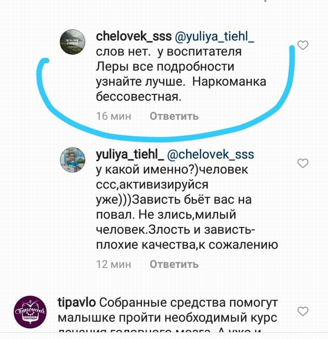 pavlodarnews.kz. Новость о талантливой шестилетней девочке, страдающей ДЦП, со ссылкой на pavlodarnews.kz, опубликовало популярное сообщество @tipavlo. Большинство комментаторов радовались за маленькую победительницу и желали ей скорейшего выздоровления, но нашлись и те, кто писал негатив. Один из пользователей написал, что, якобы, женщина сама виновата в том, что ее дочь родилась инвалидом. Шокированная незаслуженным оскорблением комментатора под никнеймом @chelovek_sss Юлия обратилась в Южный отдел полиции. Наказать хама, для мамы, воспитывающей особенного ребенка - дело принципа. - Неизвестный мне мужчина оскорблял меня, написав, что я курю не сигареты, пью и в нетрезвом состоянии езжу за рулём, буквально назвав меня наркоманкой. Я поинтересовалась у него, возила ли я его или знает он меня, чтобы он так говорил, но ничего адекватного мне не ответили, - рассказывает Юлия Верещагина. – Подобных комментаторов нельзя оставлять безнаказанными потому, что очень много таких мам, как я - с особенными детьми. Я уже привыкла к этой грязи, а вот другие уходят в депрессию и сидят дома, никуда не выходят. После словесной перепалки в социальных сетях, женщина сделала скриншоты и отправилась в Южный отдел полиции, где, по её словам, не сразу приняли заявление.