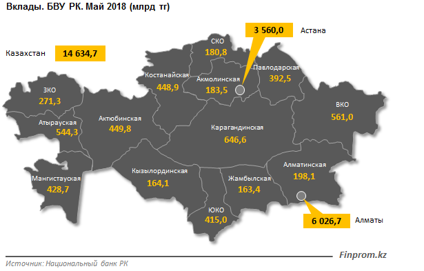 валюте сократились на 9%, тенговые - приросли на 26% Совокупный объем вкладов в казахстанских банках на конец мая составил почти 15 триллионов тенге Банковские вклады по итогам мая 2018 года кумулятивно составили 14,6 трлн тг, что на 1,3% меньше чем годом ранее - 14,8 трлн тг. Набольший объем вкладов сконцентрирован в ключевых мегаполисах - Алматы и Астане: 6 и 3,6 трлн тг, соответственно. Замыкает тройку лидеров Карагандинская область - 646,6 млрд тг. В тоже время, наибольший прирост вкладов зафиксирован в Костанайской и Северо-Казахстанской области - 16,9% и 15,9%, соответственно. ![]() Из общей суммы вкладов на долю срочных относится 72,1% или 10,5 трлн тг. Срочные банковские вклады физических лиц составили 7,3 трлн тг - это на 5,7% больше, чем год назад - 6,9 трлн тг. Рост был сформирован за счет увеличения депозитов в национальной валюте на 26,2% - с 2,9 до 3,6 трлн тг год-к-году. В то же время, вклады в иностранной валюте наоборот сократились на 8,9% - с 4 до 3,7 трлн тг. Спад интереса у казахстанцев ко вкладам в инвалюте начиная с 2016 года коррелирует с уменьшением ставки вознаграждения по данному виду вкладов. За два последних года их объем уменьшился на 21,6% (1 трлн тг), а ставка вознаграждения - на 1,2 п.п. Таким образом, на текущий момент (май 2018) соотношение депозитов в тенге и инвалюте практически одинаковые - 3,6 и 3,7 трлн тг, соответственно. По вкладам юрлиц прослеживается аналогичный тренд в те же периоды, но большими темпами - за последние два года срочные вклады юрлиц в инвалюте сократились на 51,1% или 1,4 трлн тг. На конец мая 2018 года соотношение тенговых депозитов и инвалютных - 58,2% и 41,8%, соответственно. Совокупно срочные вклады юрлиц составляют 3,2 трлн тг, что на 17,7% меньше чем годом ранее - 3,9 трлн тг. Ставки вознаграждения по вкладам для юрлиц в тенге - 7,3% (годом ранее - 8,7%), в иностранной валюте - 1,1% (годом ранее - 1,6%). Источник: Finprom.kz Последние новости: