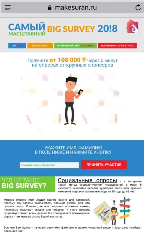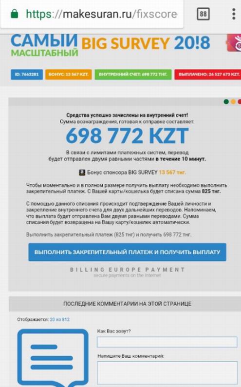 Tengrinews.kz. Злоумышленники посредством мобильных мессенджеров и электронной почты осуществляли рассылку с приглашением пройти опрос на интернет-ресурсе makesuran.ru за денежное вознаграждение с последующими выплатами средств участнику опроса. Для получения гарантированных денежных средств участнику опроса необходимо оплатить комиссию в размере 162 рубля или 825 тенге. После соглашения с условиями опроса участника перенаправляют на платежный онлайн-сервис SimplePay для заполнения данных платежной карты. "После перевода денежных средств на счет злоумышленников гарантированные денежные средства не поступали", - сообщили в организации.