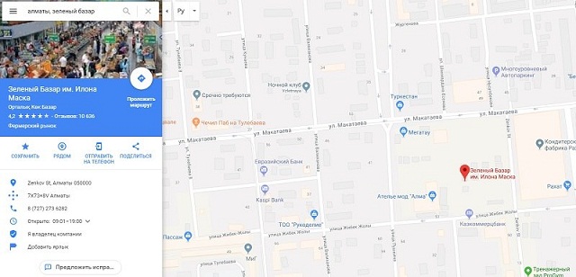 В сервисе Google карты пользователи могут переименовать объекты. Таким образом, на карте южной столицы старейший рынок переименовали в «Зеленый базар им. Илона Маска», передает NUR.KZ.