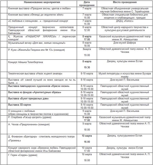 ИА Pavlodarnews.kz публикует программу праздничных мероприятий в Павлодаре с 7 по 10 марта.