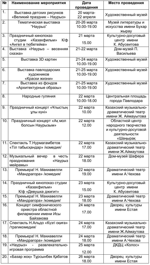 Праздничные выставки, кинопоказы, концерты и народные гулянья пройдут с 20 по 26 марта в Павлодаре в честь Наурыз мейрамы, передает корреспондент pavlodarnews.kz. Источник: pavlodarnews.kz Последние новости: