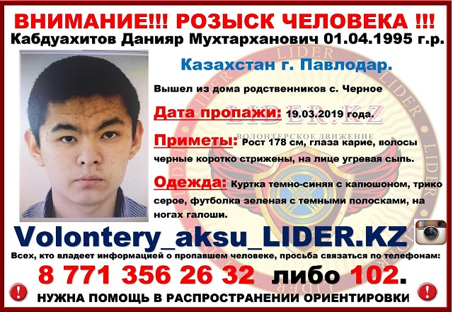 В Павлодарской области родственники разыскивают 23-летнего Кабдуахитова Данияра Мухтархановича и 82-летнего Жабцева Алексея Митрофановича, передает NUR.KZ. По информации волонтеров, Данияр Кабдуахитов пропал 19 марта этого года. Сообщается, что в этот день он вышел от родственников в селе Черное, но домой так и не попал. 20 марта его видели в селе Бескарагай. Приметы пропавшего: рост 178 сантиметров, глаза карие, волосы черные, коротко стрижены, на лице — угревая сыпь. В день пропажи был одет в куртку темно-синюю с капюшоном, трико серое, футболку зеленую с темными полосками, на ногах — галоши. Родственники обратились в полицию с заявлением о пропаже. ![]() Алексей Митрофанович Жабцев пропал 9 марта текущего года в городе Павлодаре. Он ушел из дома в неизвестном направлении. Родственники сообщают, что дедушка может быть дезориентирован. Рост пропавшего около 170-180 сантиметров, волосы седые, имеется шрам от аппендицита, на кисти левой руки — татуировка «Леня». Был одет в черные куртку, шапку, брюки и ботинки. ![]() Источник: NUR.KZ Последние новости: