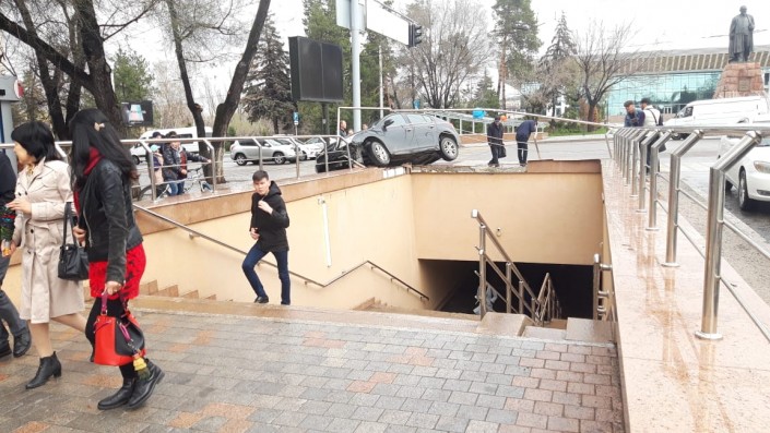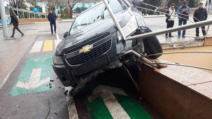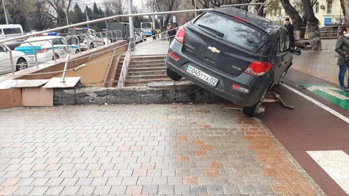 Как сообщили очевидцы, водитель двигался по проспекту Достык в северном направлении. Пытаясь повернуть налево на проспект Абая, он не рассчитал скорость и из-за погодных условий вылетел на тротуар. Далее автомобиль подлетел к подземному переходу, едва не свалился в него и повис на ограждении подземки.